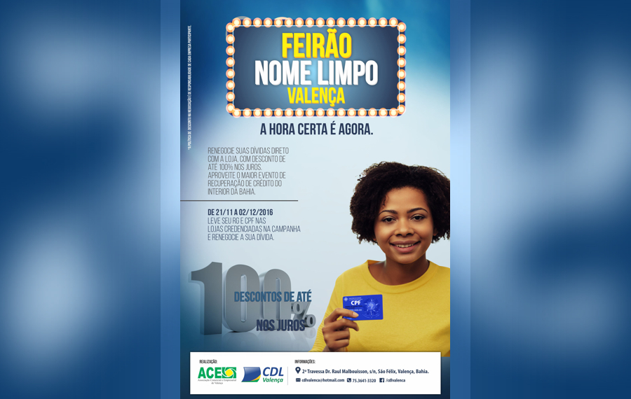 Esta é mais uma ação promovida pelo Comércio de Valença. Renegocie suas dívidas direto com a loja, com descontos de até 100% nos juros. Aproveite o maior evento de recuperação de crédito do interior da Bahia. Acontecerá de 21/11 a 02/12/2016. Basta levar seus documentos de CPF e RG nas lojas credenciadas na campanha e renegociar sua dívida.